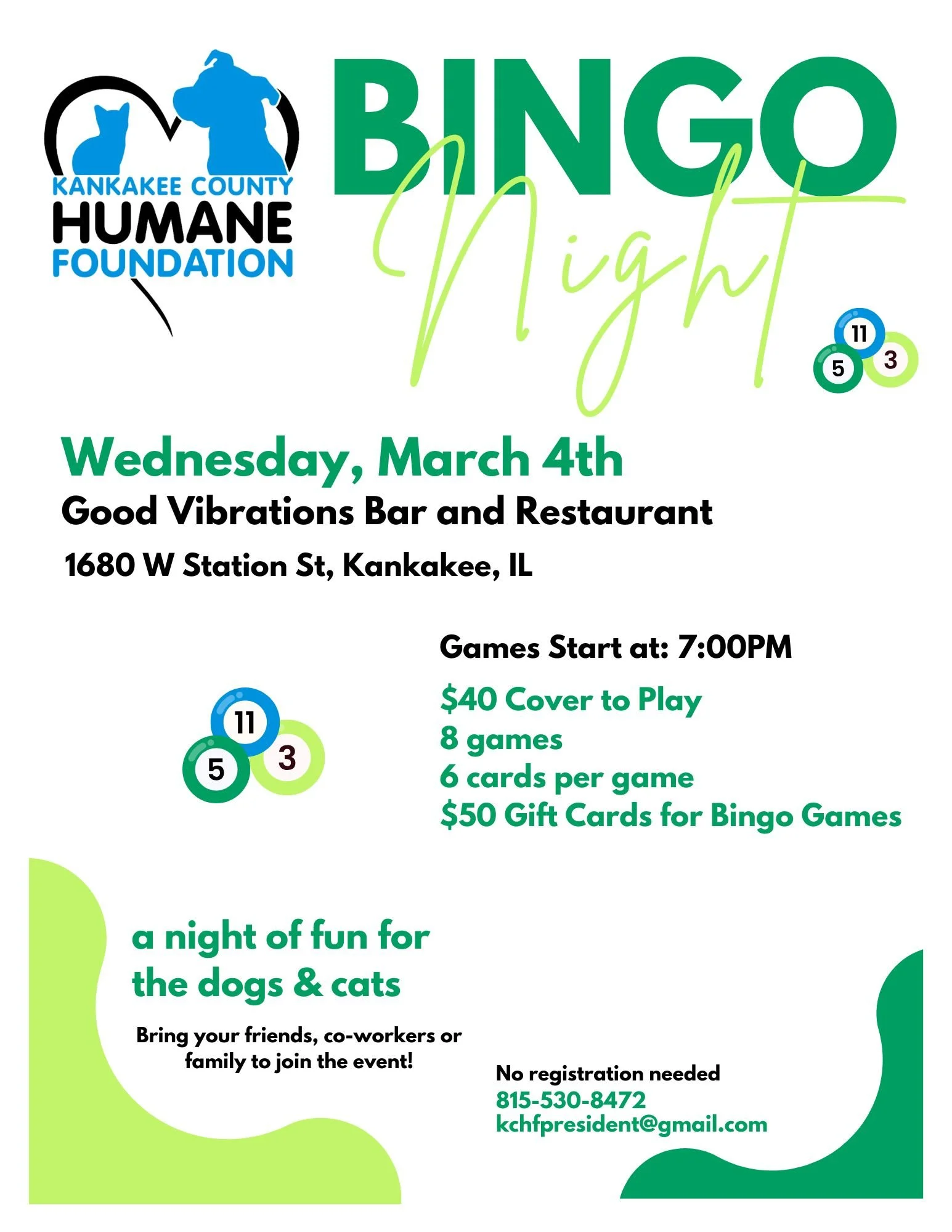 March Bingo Wednesday, March 4, 2026 6:00 PM 9:00 PM Good Vibrations Bar and Restaurant 1680 West Station Street Kankakee, IL, 60901 United States (map) Google Calendar ICS